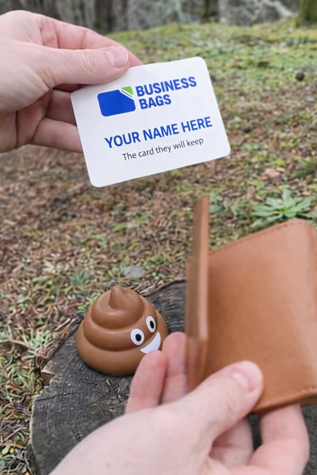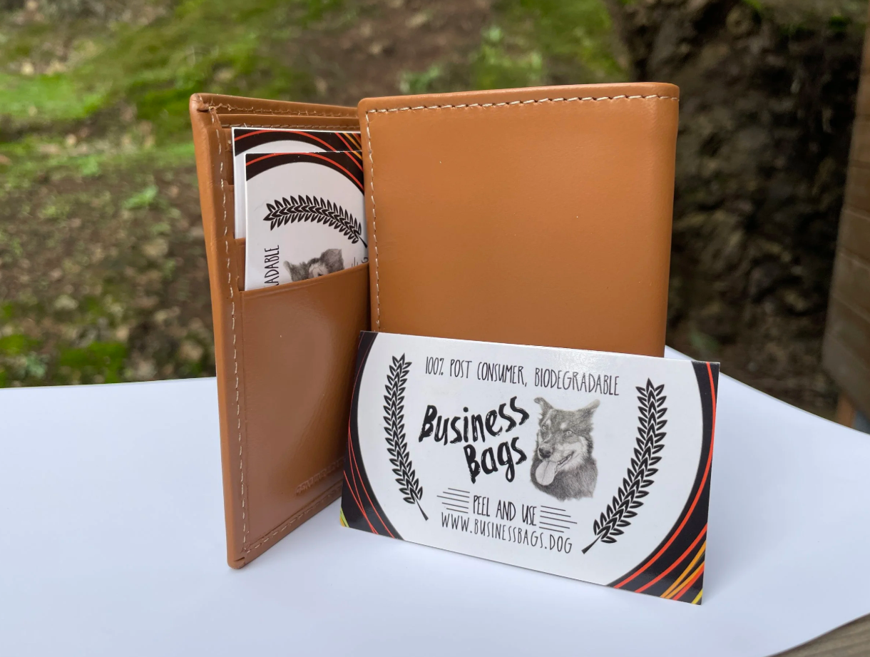 A flat, wallet-sized pet waste bag that unfolds into a full-size disposable bag.